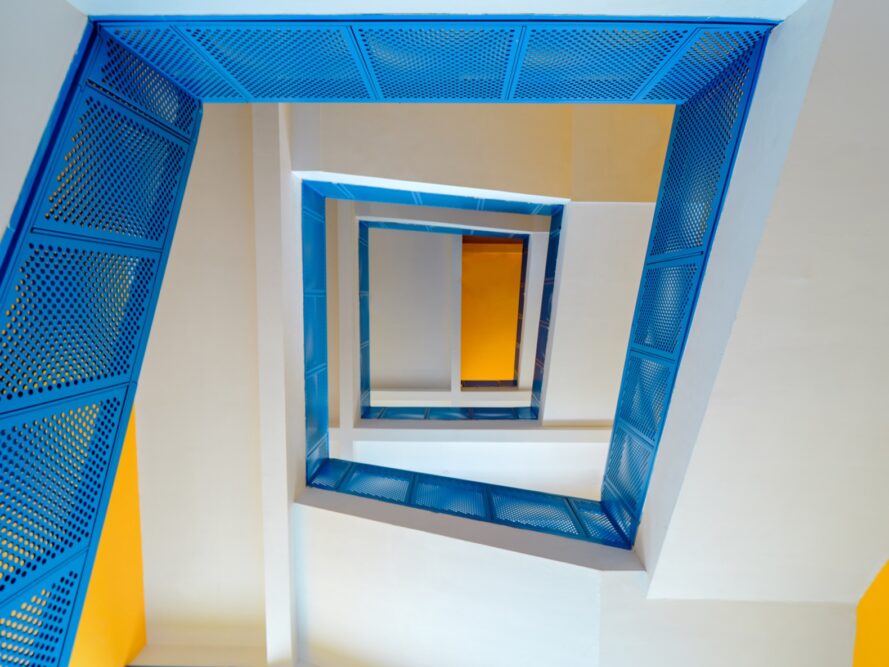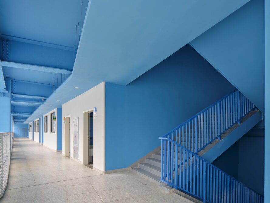 Aksen kuning menjadi warna yang menggambarkan area sosialisasi, seperti ruang serbaguna dan dorm, sementara warna biru mengindikasikan ruang sirkulasi seperti lorong dan tangga.