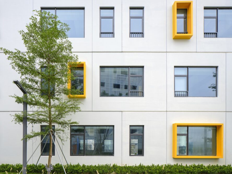 Agar arsitektur prefab tidak terkesan membosankan, arsitek dari Crossboundaries tersebut menciptakan fasad dinamis yang ditekankan melalui penggunaan warna dan jendela dengan lebar variatif mengggunakan bingkai menjorok keluar.