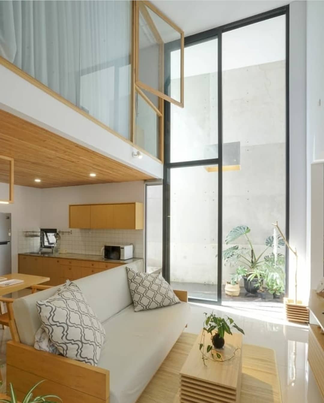 Maksimalkan area kecil dengan menciptakan mezanin, seperti kamar tidur di atas ruang makan. Mezanin sering disebut sebagai ruangan di lantai tengah (antara lantai satu dan dua) atau ruang tambahan. Dengan menggunakan sistem ini, ceiling lantai satu otomatis menjadi tinggi atau memiliki void. Sirkulasi udara dari void rumah di tengah-tengah lantai mezanin membuat hunian terasa segar.