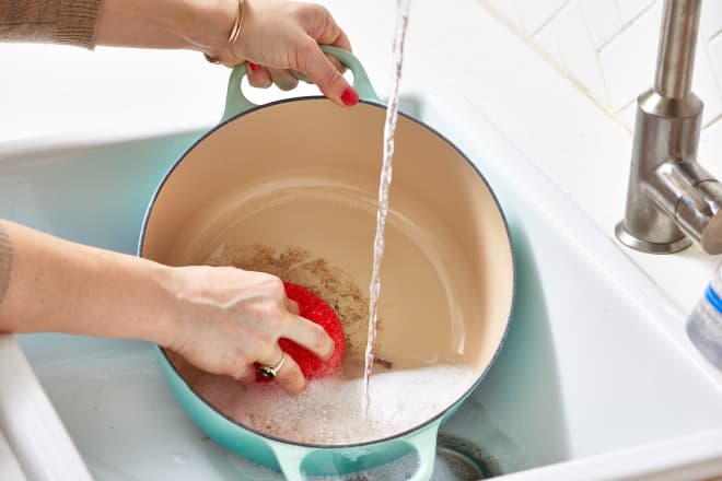 Menjadi salah satu hal yang paling tidak disenangi saat mencuci piring, yaitu mencuci peralatan berminyak yang menjadi masalah setiap individu dirumah. Anda bisa menyiasatinya dengan cara menuangkan sedikit air hangat dan sedikit sabun cuci piring ke dalam panci atau wajan ini, lalu membiarkannya sebentar hingga mendapat giliran terakhir saat dicuci. Karena di waktu itulah sisa-sisa minyak atau makanan melunak dan akan mudah untuk dibersihkan.