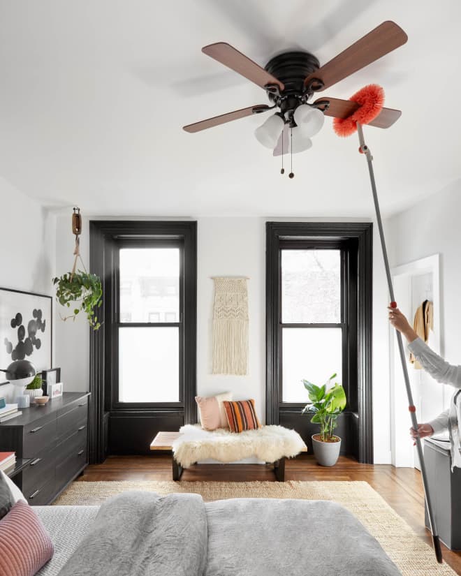Idealnya, cobalah membersihkan sesuatu dari tempat yang tinggi baru yang rendah. Karena jika Anda memulainya dari area rendah, ketika Anda membersihkan area tinggi debu yang terjatuh akan mengotori bagian bawah dan Anda akan bekerja dua kali untuk membersihkan hal yang sama. Oleh karena itu, cobalah untuk membersihkan bilah kipas langit-langit, rak buku dan penutup lampu terlebih dahulu, lalu menyedot lantai Anda.