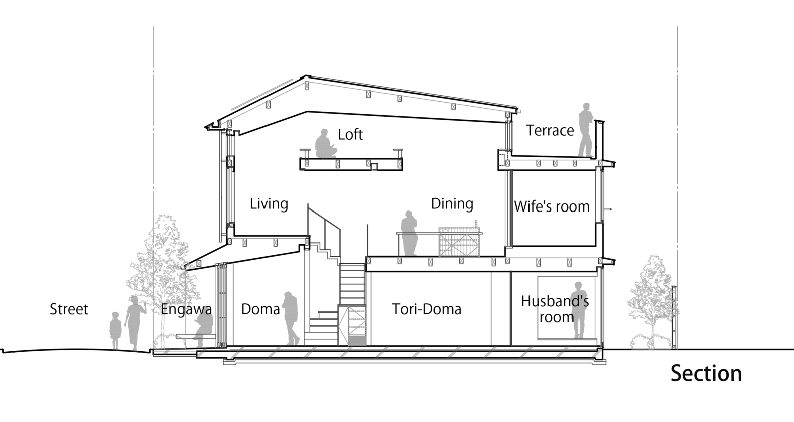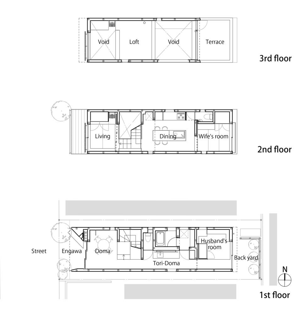 Seringkali area ini berukuran kecil. Namun, dalam Kawagoe House yang berada di kawasan Kawagoe, Jepang, area ini justru dibuat lebih luas dan semi terbuka demi mempertahankan hubungan baik dengan komunitas di sekeliling rumah. Ini berkaitan erat dengan konteks kawasan yang identik dengan festival lokal, seperti Koede Kawagoe Fireworks Display sehingga saat acara berlangsung penghuni rumah dengan mudah berinteraksi dengan festival di luar rumahnya.