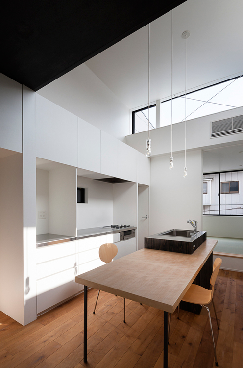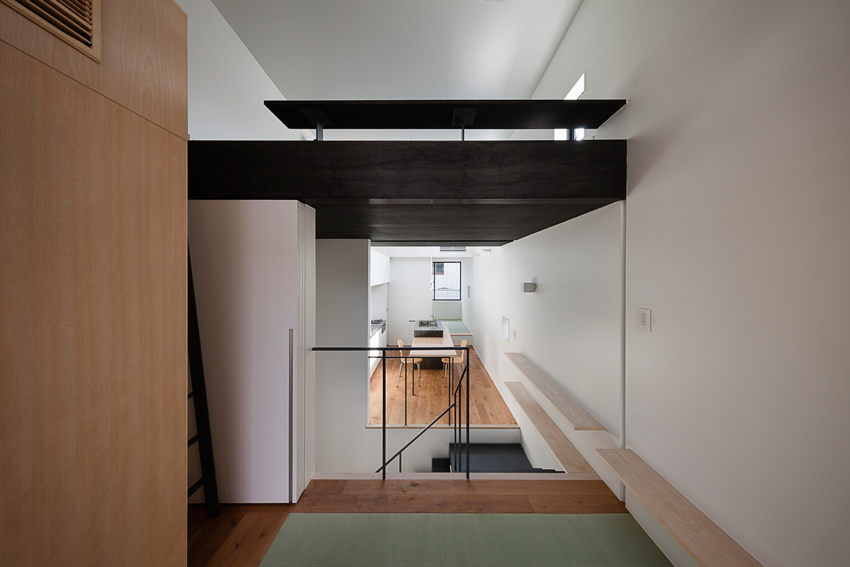 Mensiasati rumah dengan luas kurang dari 100 meter persegi dan memiliki bentuk tanah yang memanjang, arsitek membagi rumah minimalis ini menjadi tiga lantai. Selain itu, penggunaan partisi diminimalisir untuk menciptakan pergerakan ruang yang lapang. Begitu pula dengan pintu yang dirancang untuk dibuka dan ditutup sembari mengubah layout ruang sesuai kebutuhan.