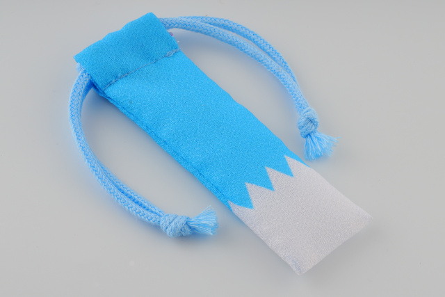 Gunting mini berbentuk pedang samurai ini hadir dengan sarung katanabukuro mini yang menampilkan motif segitiga biru dan putih khas Shinsengumi untuk pedang Hijikata dan Okita, dan gradasi ungu untuk pedang samurai Nobunaga.