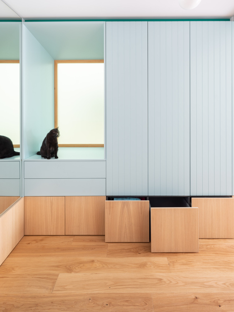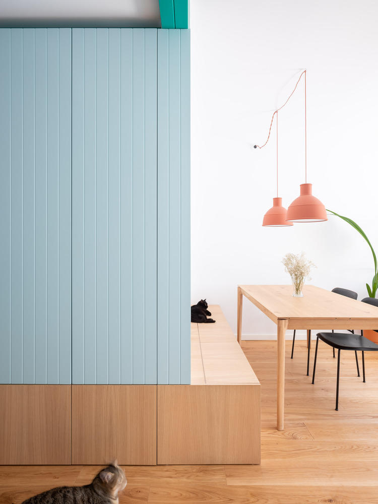 Garis vertikal memberikan ilusi ruangan yang lebih tinggi. Begitu pula saat menerapkannya pada pintu lemari. Lapisi pintu tersebut susunan kayu panjang secara vertikal sehingga ruang tidak terasa membosankan berkat tekstur yang tercipta. Dengan demikian, warna biru ini tak harus hanya dihadirkan dengan menggunakan cat pada rumah modern.