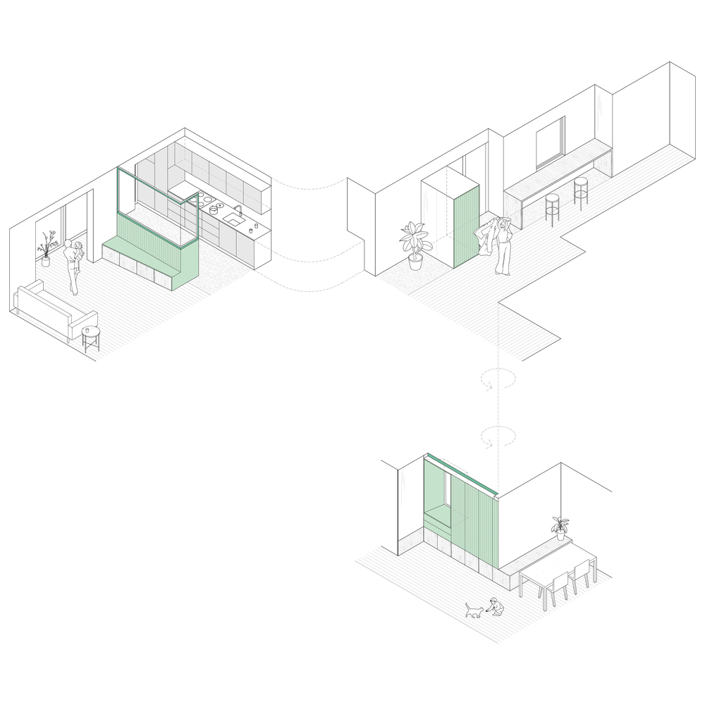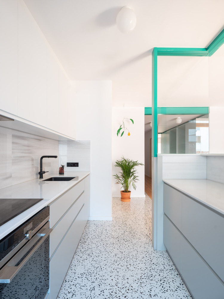 Jika ingin memberikan zoning pada salah satu area seperti pantry namun tetap ingin elemen desain yang selaras dengan keseluruhan rumah, gunakan material teraso pada lantai dengan corak dasar berwarna putih.