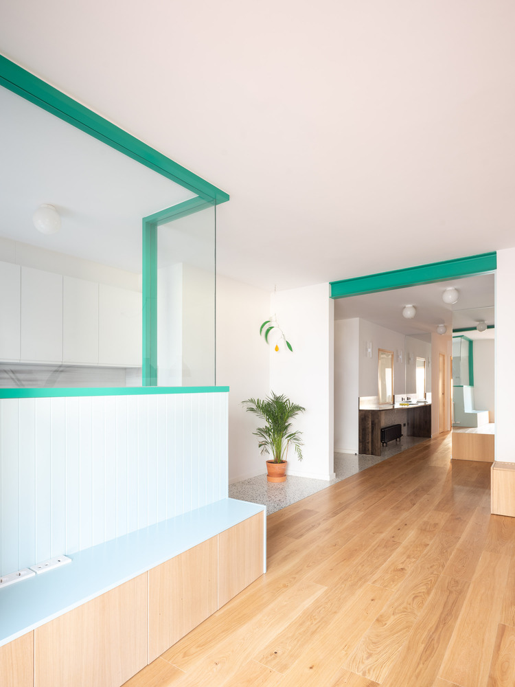 Dengan kombinasi warna biru, putih, serta coklat yang telah diterapkan, desain rumah bisa saja terkesan pucat serta kurang homey. Untuk menghindari hal itu, pada beberapa pinggiran seperti di partisi maupun jendela, Anda bisa menggunakan warna hijau torquise ataupun warna yang lebih gelap untuk disandingkan dengan warna biru ini.