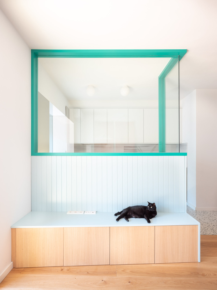 Agar memaksimalkan kesan terang dan ringan pada ruang, warna biru tak harus dibalurkan ke seluruh permukaan dinding. Cukup pilih bagian tertentu yang dianggap sebagai elemen unik pada interior rumah. Contohnya seperti partisi antara dapur dan ruang tamu maupun lemari di salah satu sudut rumah yang lalu dapat dipadukan dengan dinding putih.
