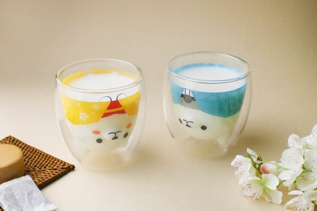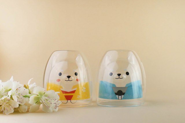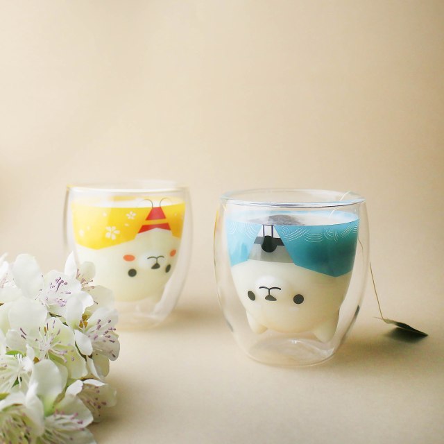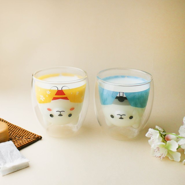 Pada koleksinya kali ini, dua set gelas menampilkan figur anjing Shiba berpasangan dengan kostum kimono berwarna biru dan kuning, lengkap dengan aksen bunga sakura.