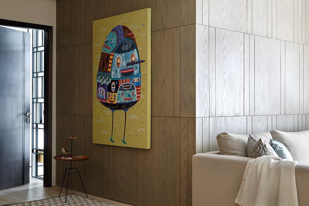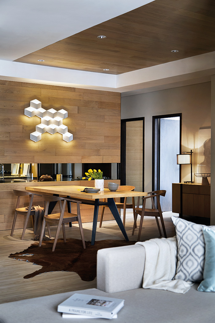 Berbicara mengenai nilai praktis pada hunian ini juga tercermin pada desain lemari yang simetris melekat pada dinding. Kontur pintu lemari didesain mengikuti wall treatment yang melekat menyamarkan bentuk aslinya sehingga tampak sebagai bagian dari ruangan. Garis-garis lugas dari kayu dihadirkan sebagai rak untuk ornamen dan buku di antara televisi. Nuansa cozy diperkuat dengan three seater sofa berbentuk siku, dua coffee table bervariasi bundar, serta satu single chair berwarna senada. Kesan etnik ditorehkan Eko Priharseno dengan membubuhkan beberapa detail khas Indonesia seperti karpet yang terinspirasi corak tenun, sendok sagu Papua sebagai aksesori interior, hingga wallpaper dari serat bambu untuk memberikan kehangatan pada ruang. Lukisan karya Hendra ‘He-He’ yang terpajang di salah satu dinding memberikan percikan playful di antara warna-warna kayu yang mendominasi.