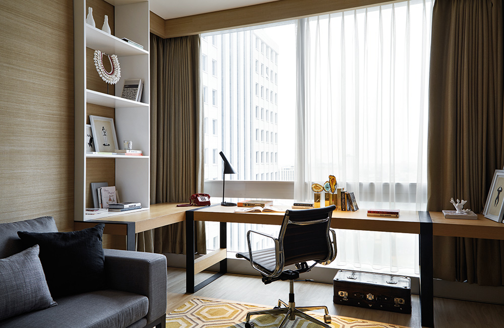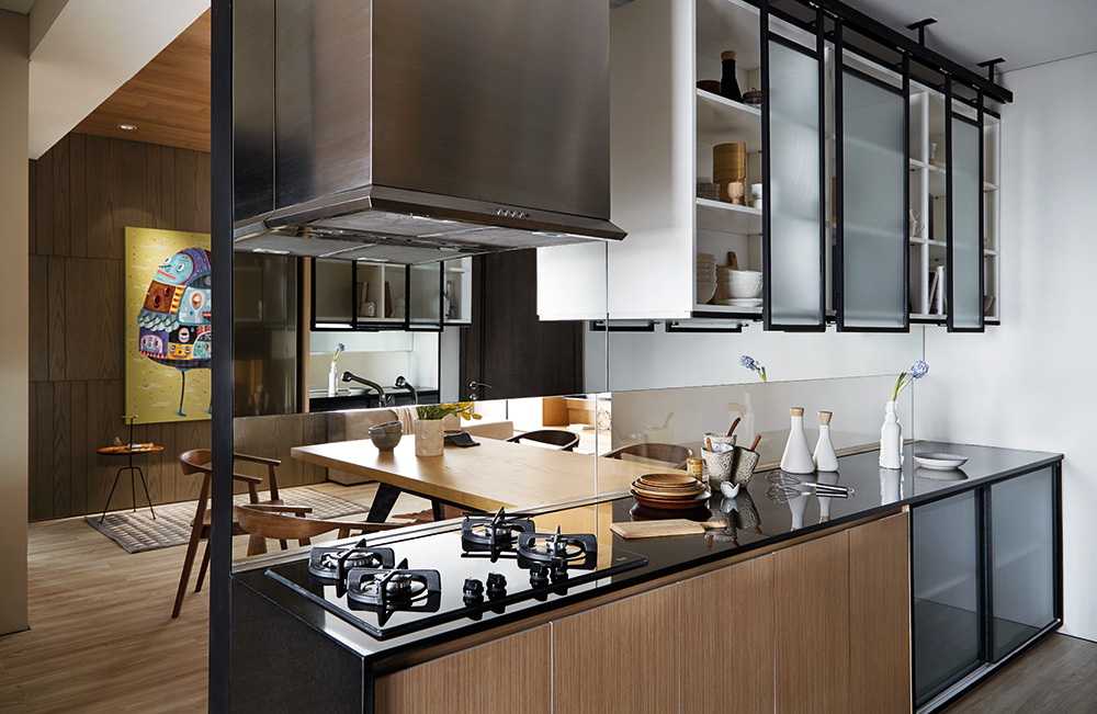 Kecerdasan dalam pemanfaatan ruang turut tertuang dengan menyatukan dua ruang sebagai ruang studi. Tidak hanya itu, sekat di antara dapur dan living room dihilangkan untuk memaksimalkan fungsi interaksi bagi penghuni. Eko Priharseno menarik garis di antara dua dinding pada ruang studi dengan pemandangan kota untuk memberikan kesegaran tersendiri saat penghuni ingin bekerja. Sudut-sudut dan permainan detail sampai tata cahaya yang dirancang oleh SSA Lighting menorehkan kesan maskulin yang kental namun juga integritas fungsi ruang yang saling menunjang satu sama lain. Simplified life.