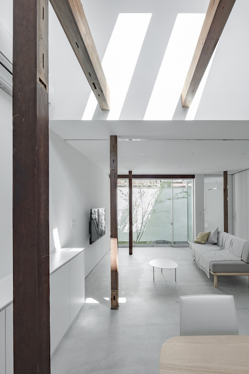 Desain Machiya yang memanjang ke belakang dan tanpa jendela semula membuat rumah terasa gelap dan redup. Mengikuti tema modern pada hunian, arsitek asal Jepang ini menambahkan sebuah skylight agar pencahayaan alami dapat memasuki dalam rumah.