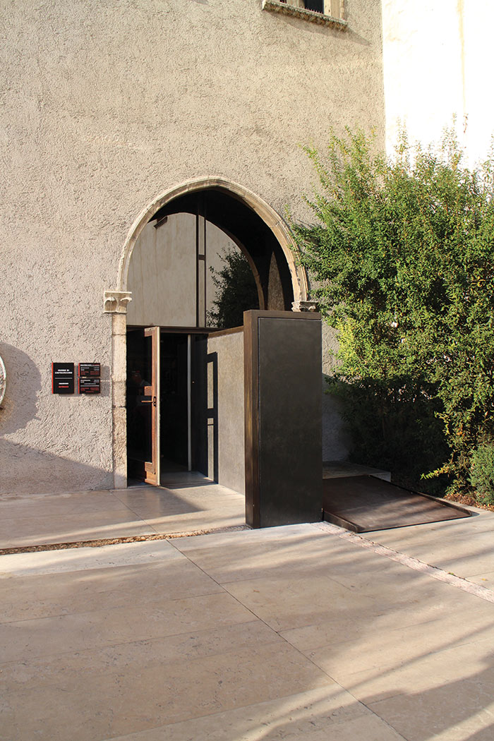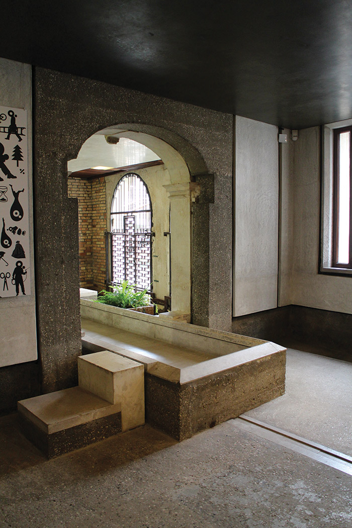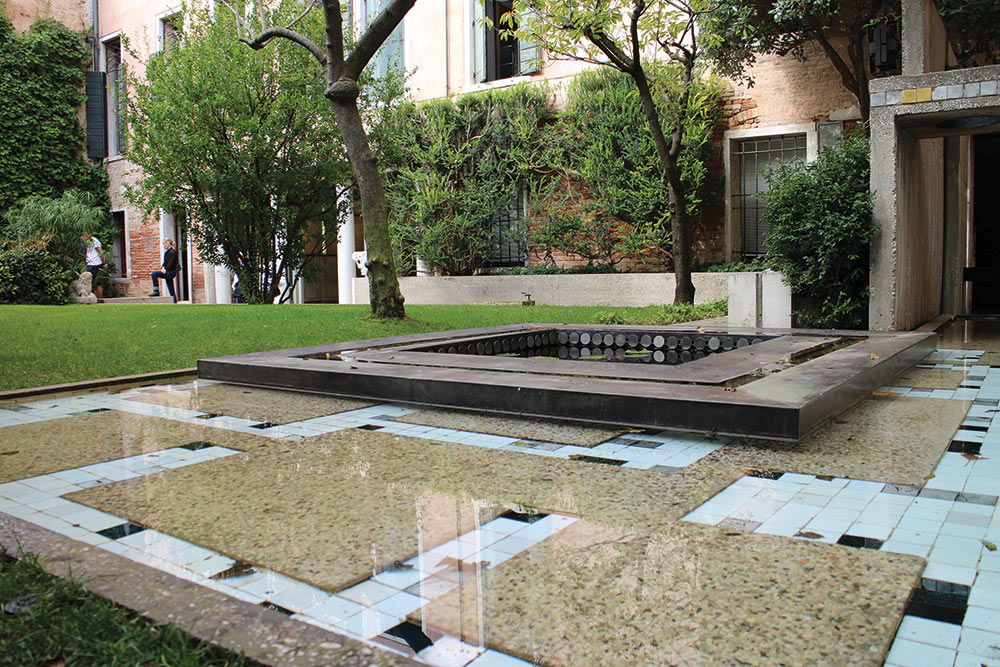 Tahun 1959-61, Carlo Scarpa mendesain restorasi lantai dasar Fondazione Querini Stampalia untuk mengakomodasikan ruang serba guna, galeri temporer dan taman dalam. Proyek ini kemudian berhasil menghadirkan intervensi arsitektur yang merangkul fenomena pasang surut air kanal tempat air dapat masuk ke dalam sebagian ruangan lantai dasar. Scarpa membatasi “kanal” air di dalam gedung menggunakan material batu Istria yang memang lazim digunakan di kota Venezia. Fitur desain detail kuningan di antara batu Travertine pada dinding ruang serba guna ini merupakan solusi desain dari Scarpa untuk menggantungkan barang seni pada dinding tanpa harus merusak dinding batu dengan lubang paku.