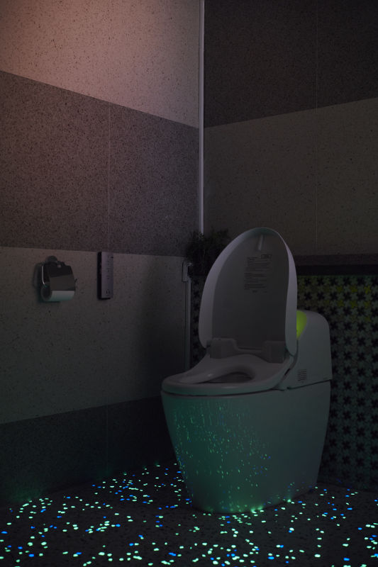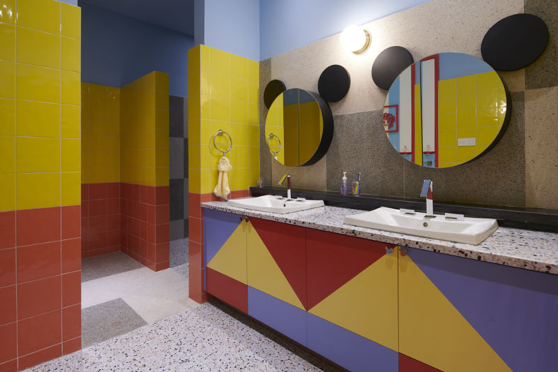 Studio Kuskus mengombinasikan lantai teraso dengan batu fosfor yang dapat menyala sebagai penuntun di kamar mandi anak / Artipictures