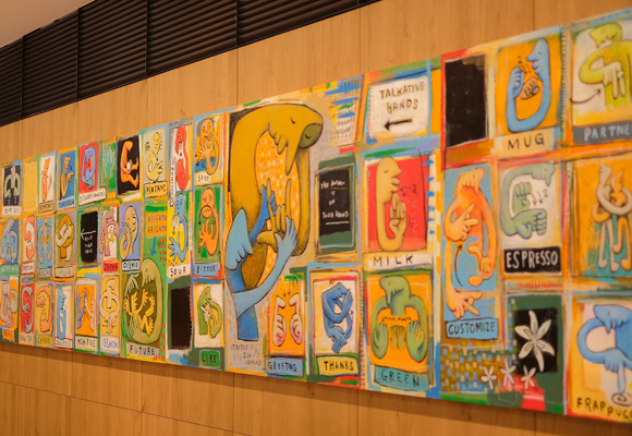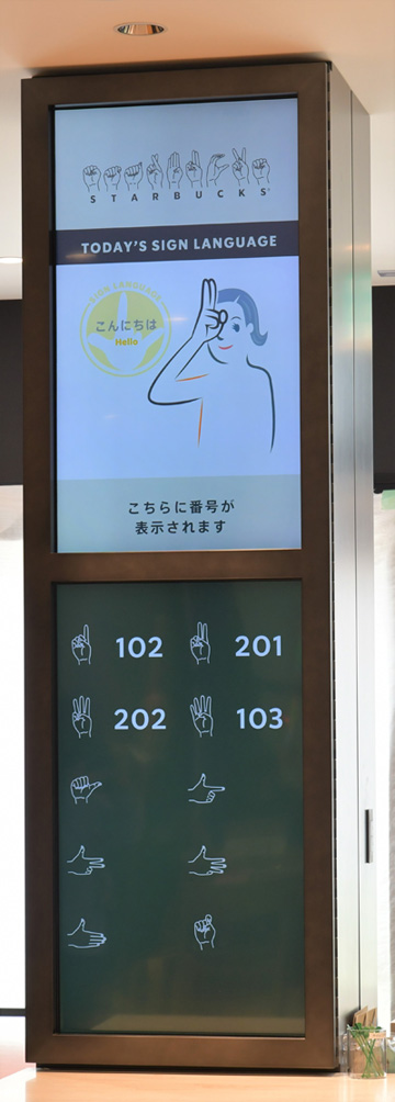 Kedai kopi Starbucks ini juga memiliki layar digital cukup lebar yang secara rutin menampilkan bahasa isyarat sederhana, yang bisa digunakan untuk berkenalan dan percakapan sehari-hari.