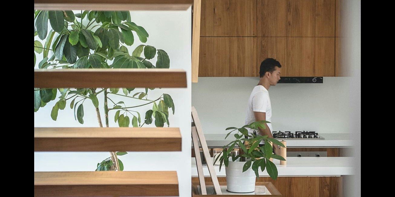 Townhouse berlantai 3 ini memiliki desain yang simpel dan hangat dan menyerupai perpaduan desain yang disukainya.
