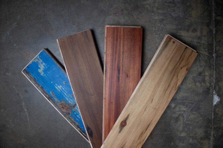 Setiap panel terdiri dari kayu besi dan akasia yang telah didaur ulang setebal 4mm dengan dasar berupa plywood eukaliptus setebal 15mm.