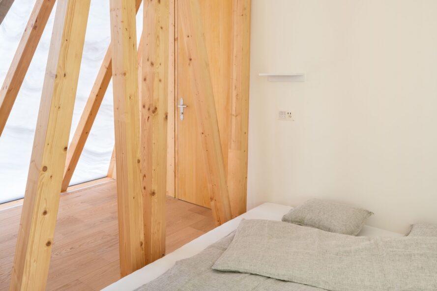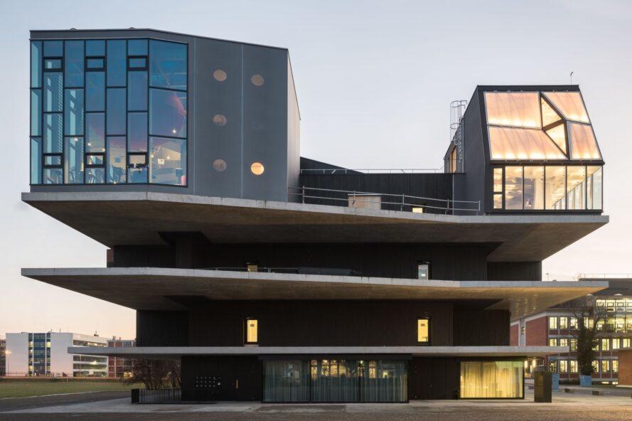 Di lantai dasar yang menjadi ruangan umum, dibangun menggunakan beton, sedangkan dua lantai residensial di atasnya yang menggunakan rangka kayu dibangun oleh konstruksi robot.