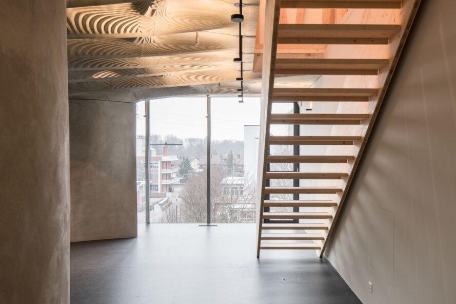 Masuk ke interior, konstruksi inovatif menggunakan printer 3D menciptakan dinding melengkung dan beton-beton bergelombang yang indah.