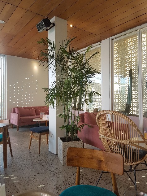 Warna pink pastel, hijau, dan biru tua serta mural bergambar dedaunan tropis pada dinding restoran menambahkan kesan elemen interior yang modern.