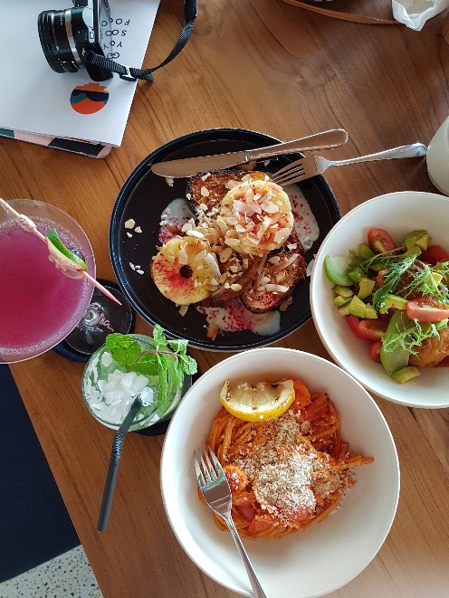 Searah Jarum Jam: French Tropical Toast, Corn Fritters & Avocado, Tiger Prawn Pasta. Coconut Mojito, Martika Berry Martini.