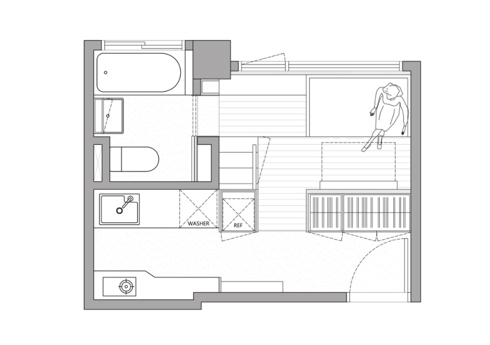 Dengan luas yang amat sangat terbatas, sang arsitek menyulap hunian tersebut berisikan semua kebutuhan sang pemilik rumah, mulai dari kamar tidur, kamar mandi, dapur, area laundry, hingga tempat penyimpanan lainnya.