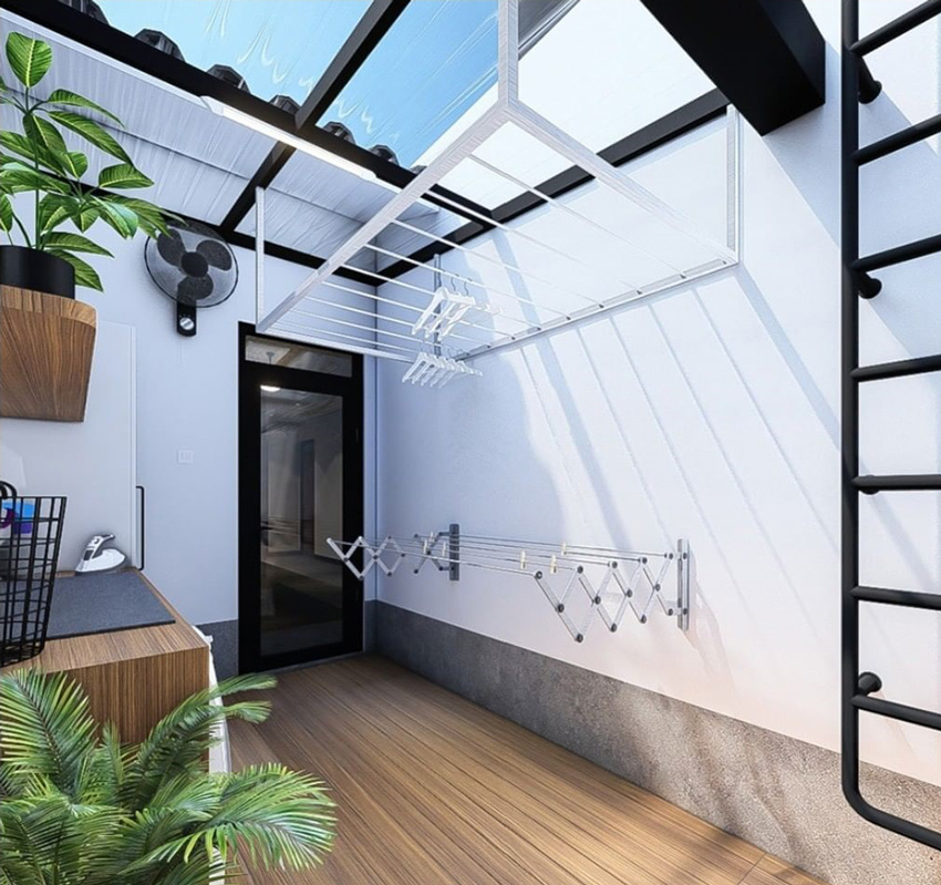 Belakang rumah yang kerap digunakan sebagai tempat menaruh mesin cuci serta peralatan bersih-bersih, bisa dioptimalkan menjadi tempat jemuran juga. Taruh rangkaian kerangka metal pada langit-langit serta sematkan tangkai jemuran versi lipat sehingga meningkatkan kapasitas jemuran di belakang rumah.