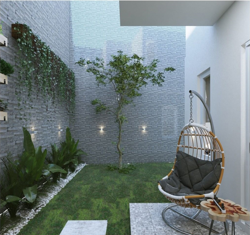 Dengan sebuah hanging chair dan coffee table, Anda bisa merubah teras yang berukuran mungil menjadi sudut bersantai di taman belakang rumah.Â