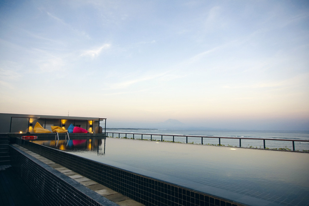 Selain itu, hotel juga dilengkapi dengan dua kolam renang, satu berada di lantai dasar dan satu infinity pool di lantai paling atas yang menawarkan pemandangan laut lepas.