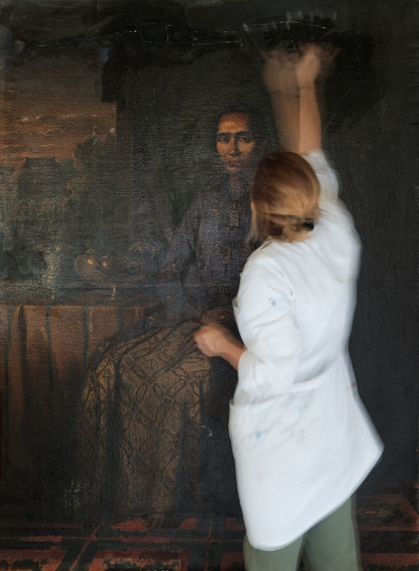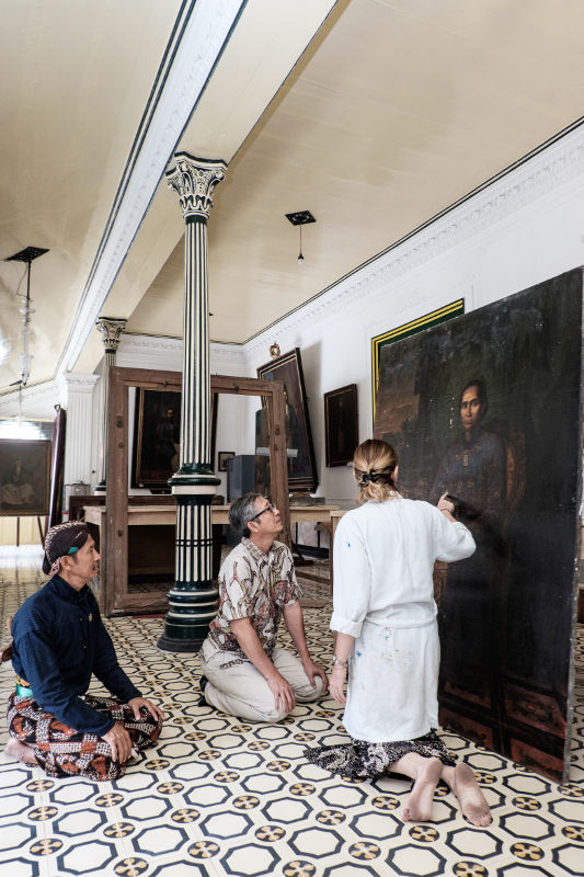 Michaela sedang mengerjakan proyek restorasi lukisan Raden Saleh, “Gusti Kanjeng Ratu Hageng” / Eri Rama Putra, courtesy of Kraton Yogyakarta