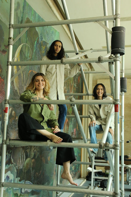 Michaela bersama dua muridnya; Muhammad Rusyan Yasin dan Hazim Muhammad Zarkasyi Hakim / Sarasvati Art Communication and Publication, courtesy of Hotel Indonesia Kempinski
