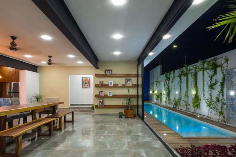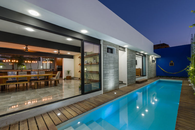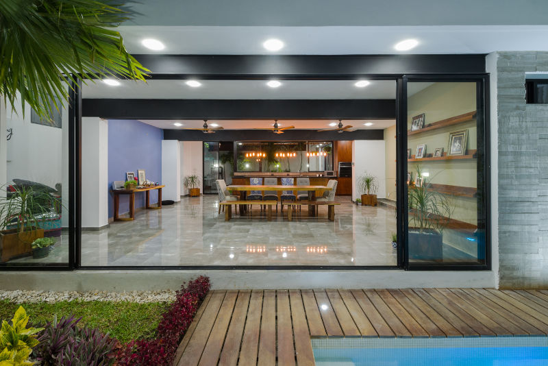 Jaime mengaplikasikan pintu geser yang lebar agar kolam renang dan ruang makan yang juga sudah luas dapat terhubung. Tanpa partisi yang berlebihan dengan kolam air membuat suasana lebih sejuk dan menyenangkan.
