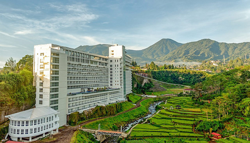 Kompleks Le Eminence Hotel Convention & Resort yang dikelilingi pegunungan dan sungai di bawahnya (foto: dok. Le Eminence Hotel Convention & Resort)