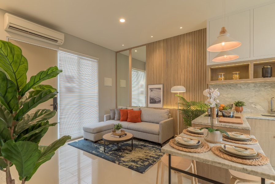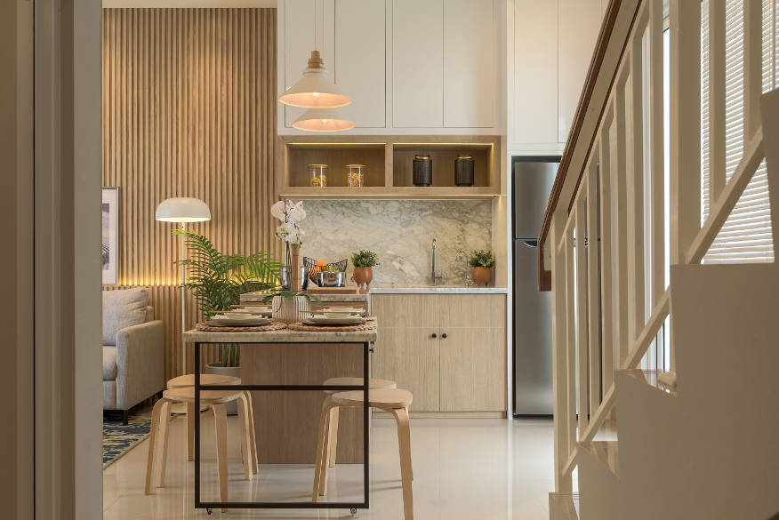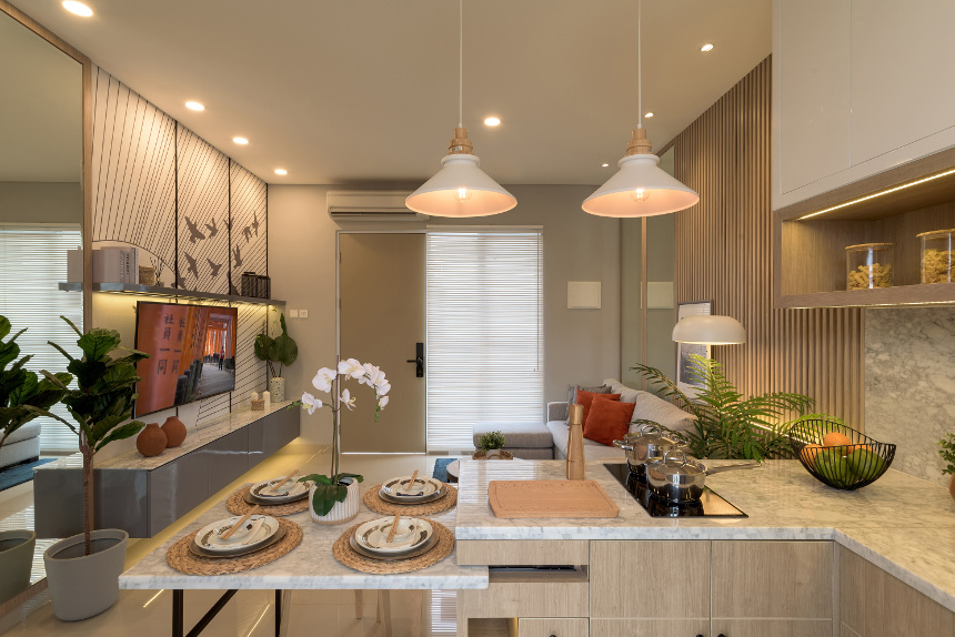 Cara ketiga adalah ruang integrasi. Bagaimana cara memiliki dapur dan ruang makan yang terasa lega, namun ternyata space yang dimiliki sangat terbatas? Solusi adalah menyatukan kedua area tersebut, karena memiliki kegiatan yang saling berkaitan. Metode desain ini semakin banyak diterapkan di Indonesia karena kapasitas hunian yang semakin compact. Pada Nara Village ini menggunakan meja makan kecil yang berdekatan dengan dapur.