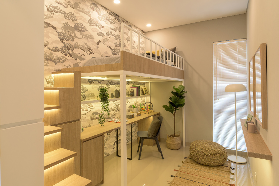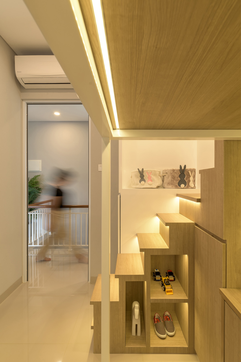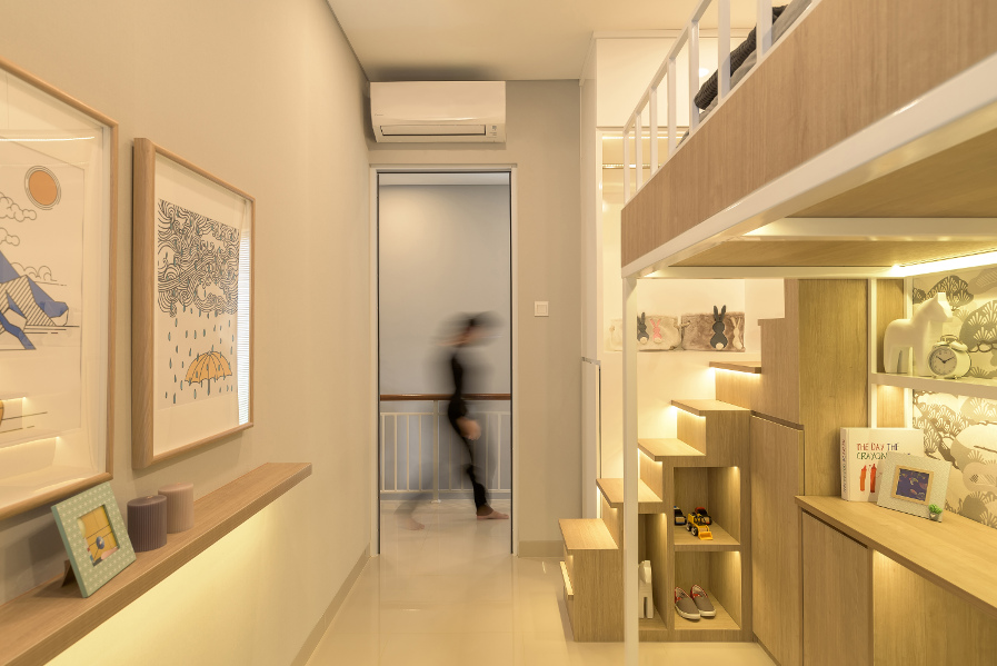 Perancangan area di rumah compact haruslah efisien dan cerdas. Cara pertama adalah dengan memanfaatkan ruang kosong seperti area bawah tangga. Kedua, kamar anak yang dijelaskan di poin sebelumnya adalah salah satu implementasi furnitur multifungsi. “Dengan pemanfaatan ruang yang baik, kami dapat memberikan fungsi ruang yang maksimal dan menunjang kegiatan pengguna di dalamnya.”