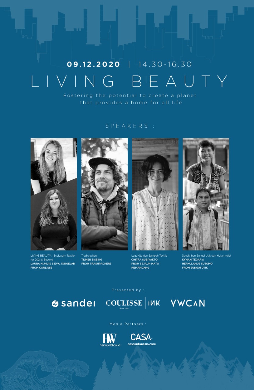 Berangkat dari rasa kepedulian akan sustainability dan kesehatan bumi, acara Living Beauty ini diselenggarakan oleh Sandei, Coulisse INK, dan YWCAN dengan berbagai nara sumber dari berbagai profesi. Webinar ini diselenggarakan lintas kota, bahkan negara, yaitu dari Jakarta, Kalimantan, Belanda, dan Singapura.