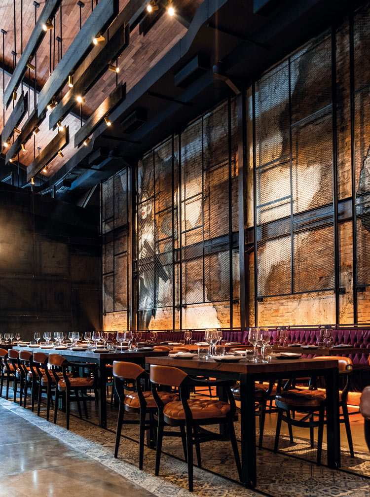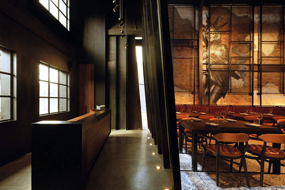 Keserasian desain lainnya tampak melalui main entrance yang berada di samping bangunan, bukan di muka depan. Pintu besi berukuran besar menyuguhkan kemantapan tersendiri saat dibuka-tutup hingga mencuatkan aura maskulin yang dominan di baliknya. Sementara itu, greetings area berhadapan dengan dinding dan kolom besi yang juga berwarna legam sebelum membawa pengunjung pada dining area berkapasitas sekitar 80 orang. Penempatan dinding besi tersebut dibuat untuk menjaga privasi pengunjung yang sedang bersantap tanpa merasa terganggu dengan pengunjung lain yang lalu-lalang. Saat berada di tengah dining area, paras industrial Amerika begitu lekat terasa di setiap sudut Boy’N’Cow, cukup kontras dengan restoran di kawasan sama yang tetap mempertahankan aksen gaya Bali.