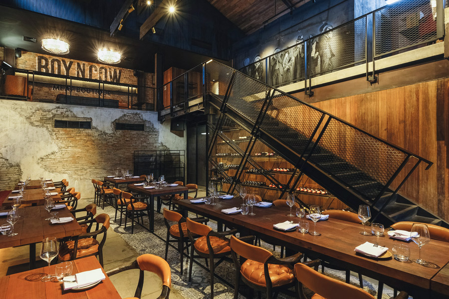 Beranjak dari keinginan untuk membawa sensasi kuliner Paman Sam, A & Partners digaet untuk mendesain Boy’N’Cow. Mengawali perjalanan desainnya, Boy’N’Cow tampil dengan fasad bangunan menyerupai gudang tua. Bata ekspos dan bingkai jendela besi berwarna legam dengan cahaya lampu kuning menyiratkan bangunan pabrik tempo dulu. Sekilas fasadnya memang tampak lebih tertutup bila dibandingkan dengan tipe restoran di Bali yang sebisa mungkin tampil terbuka.