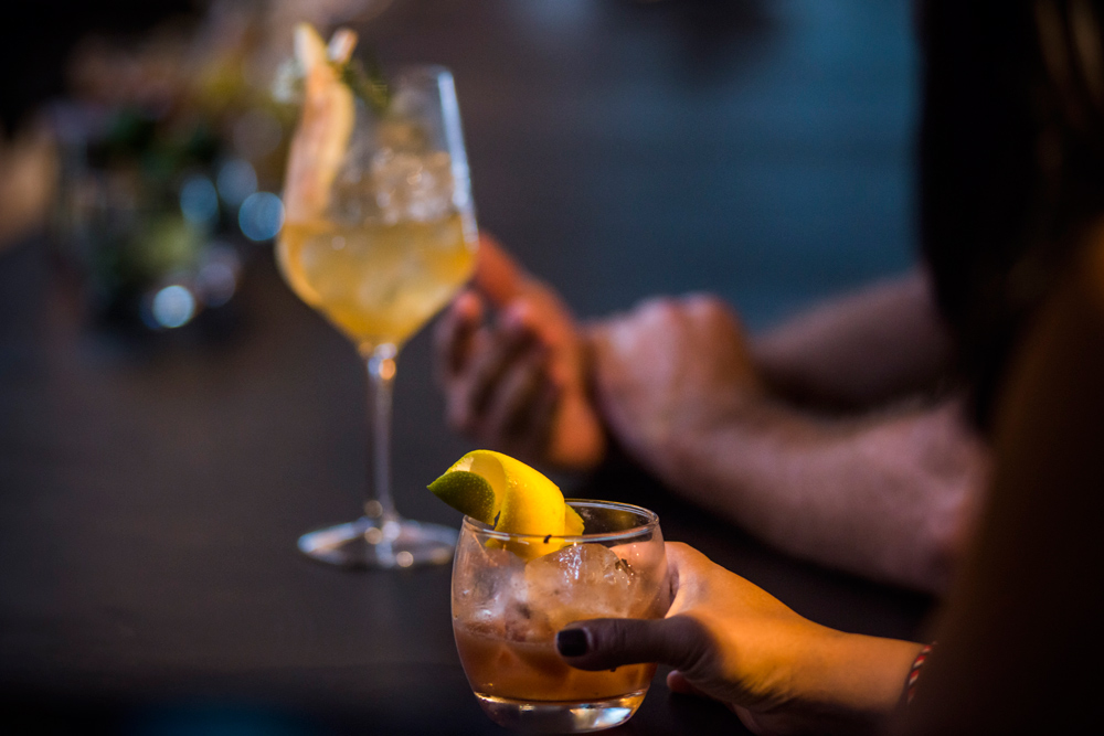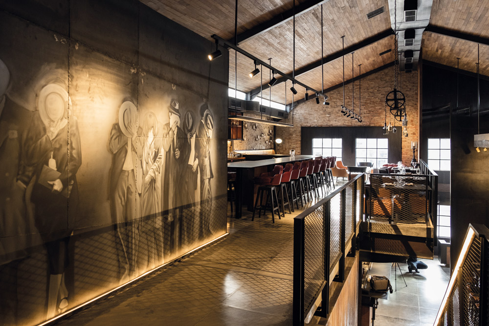 Wajah ‘bangunan tua’ membalut dinding pada interior beserta graffiti karya seniman Brian ‘Tazroc’ Garcia. Terdapat dua gambar besar yang menghiasi dinding yaitu sosok pria mengenakan vest hitam dan aktris legendaris Marilyn Monroe mengenakan headpiece mengadaptasi patung Liberty di kota New York. Ada satu teknik desain yang diaplikasikan pada dining area yaitu adanya rel yang menghubungkan dining table di bagian tengah. Tujuan pembuatan rel adalah untuk efisiensi kebutuhan pengunjung, bila diperlukan untuk jamuan dengan jumlah banyak maka meja-meja tersebut cukup digeser dan dengan mudah dipisah kembali.