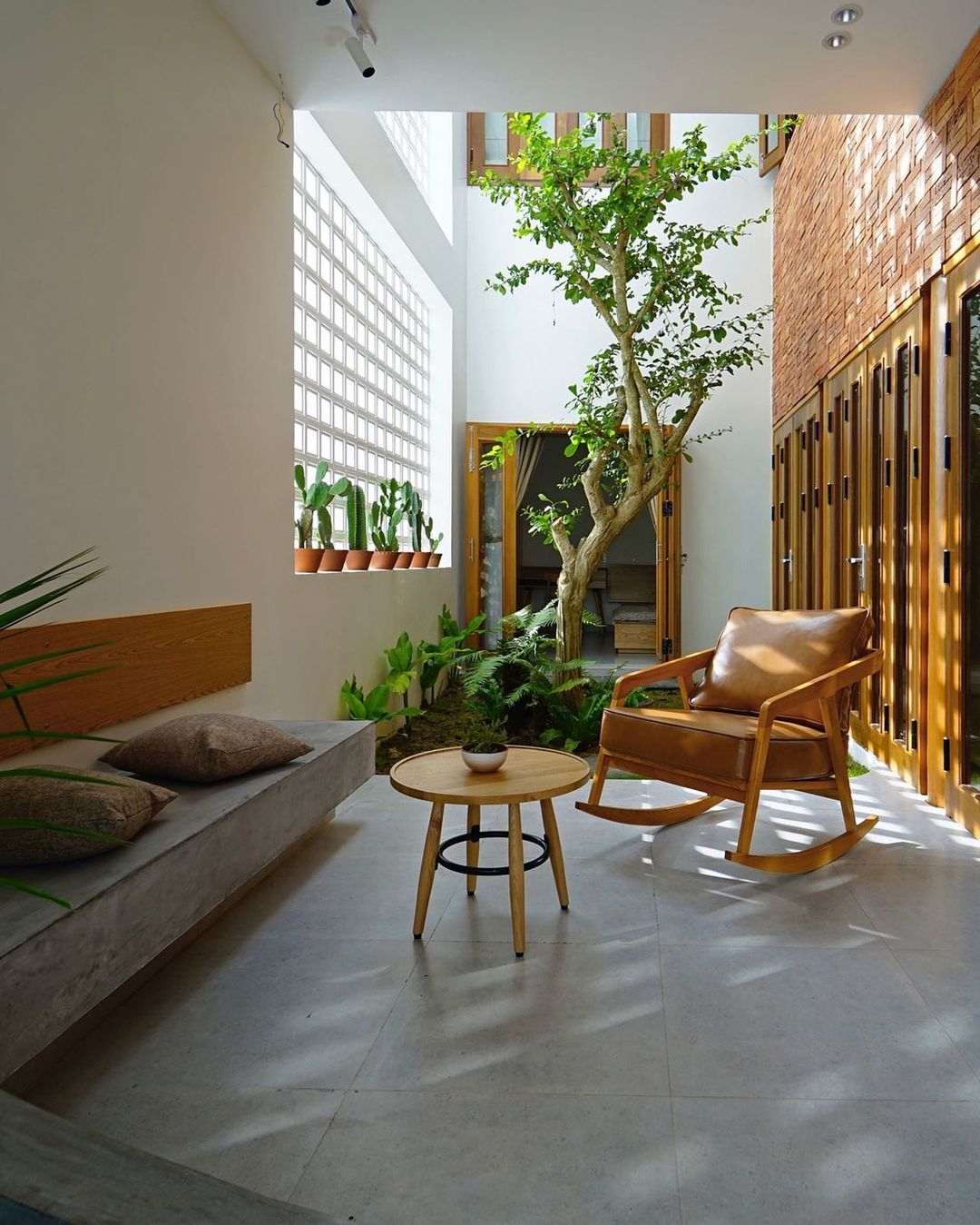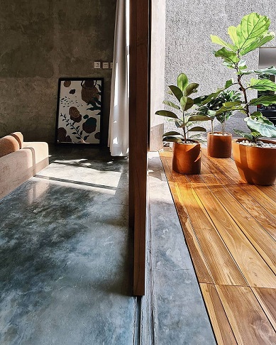 Sediakan sedikit lahan kecil di dalam rumah untuk taman sederhana dan buatlah ruang tamu atau ruang keluarga dengan tempat duduk dari kayu atau beton ekspos sehingga tahan untuk segala cuaca. Asik banget lho buat ngobrol sambil menikmati kopi sore atau zoom meeting lagi hujan