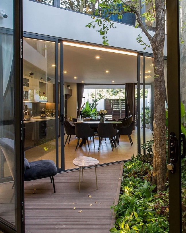 Jika Anda punya teras yang berhimpitan dengan living room, disarankan menggunakan sliding / folding door kaca. Dengan adanya bukaan antara kedua area ini dapat memaksimalkan sirkulasi cahaya. Ditambah lagi, dapat menyegarkan mata dengan melihat si hijau-hijau setiap saat. Ini berlaku untuk taman ukuran besar dan kecil, mari maksimalkan ruang!