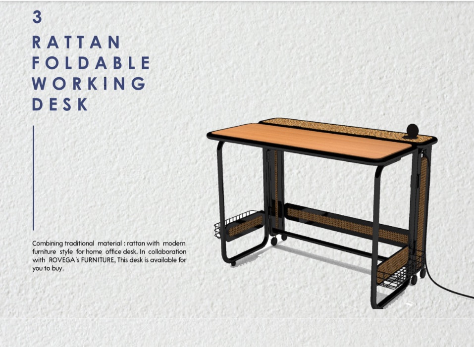 Ada tiga hasil desain mebel mahasiswi jurusan Desain Produk UPH 2018 yang dipilih karena memberikan nilai inovasi pada situasi bekerja di rumah yang sesuai dengan kondisi interior perumahan masyarakat Indonesia yang pada umumnya memiliki keterbatasan ruangan. Salah satunya yaitu meja kerja hasil rancangan Agnes Veronica.