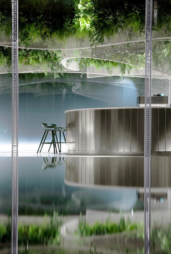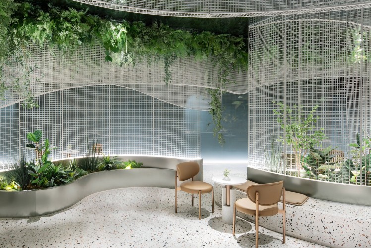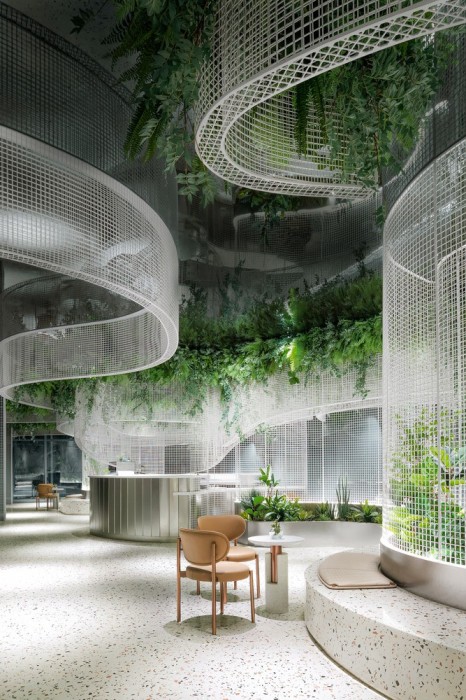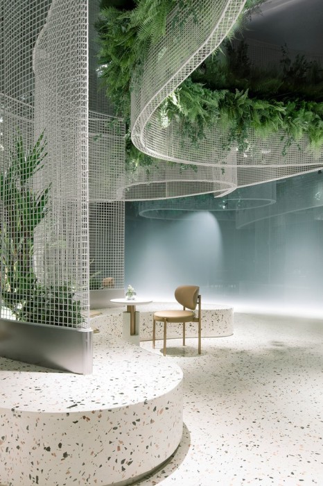 Hadirnya kaca gradien memperkuat suasana dreamy di area kafe dengan material terrazzo putih yang dikombinasikan dengan pencahayaan linier menambah kesan takjub bagi setiap pengunjung yang berada di dalam. Selain itu, sang desainer juga menambahkan elemen tanaman bak taman di dalam struktur logam bersamaan dengan pepohonan dan bunga indoor yang menciptakan suasana rileks dan menyenangkan.