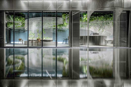 Visual kafe yang masif dengan bentuk-bentuk organis menyerupai sehelai pita yang berkibar tertiup angin ini terbentuk dari kisi-kisi logam putih yang dipadukan dengan pencahayaan yang menekankan pada bentuk ‘fluida’ yang mengalir dan berpadu dengan elemen interior lain di dalam kafe.
