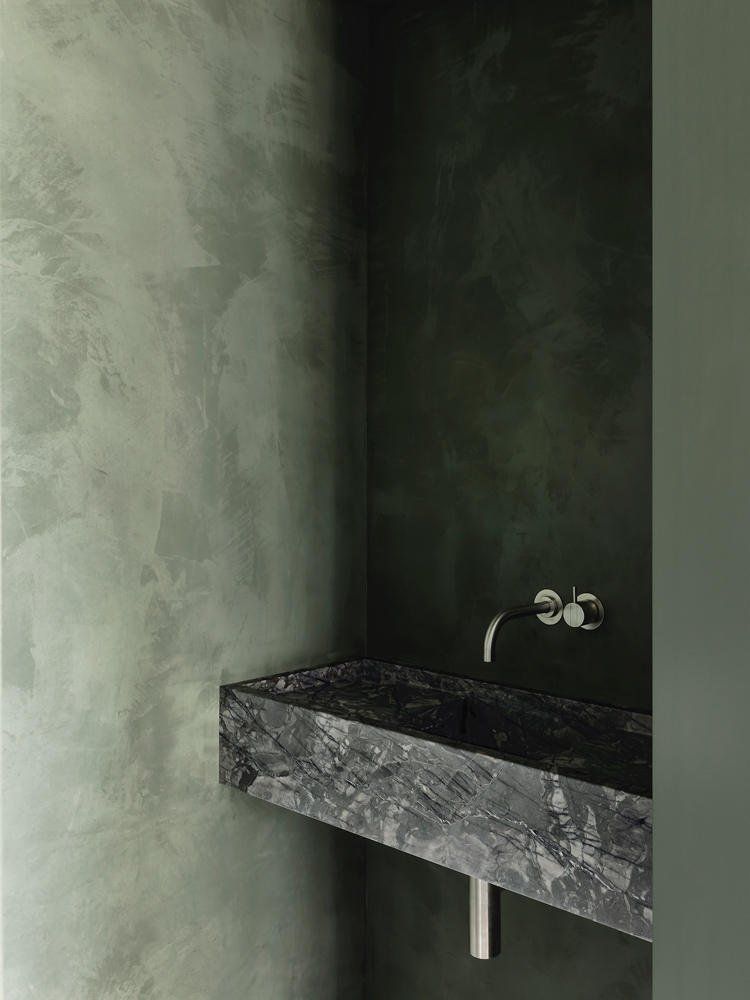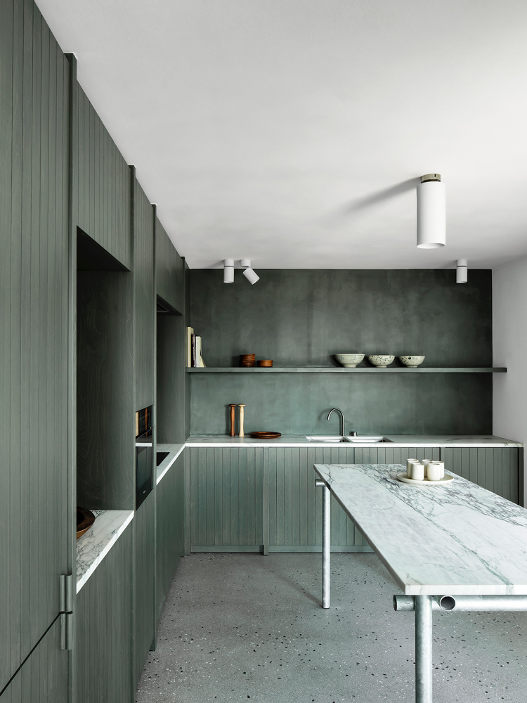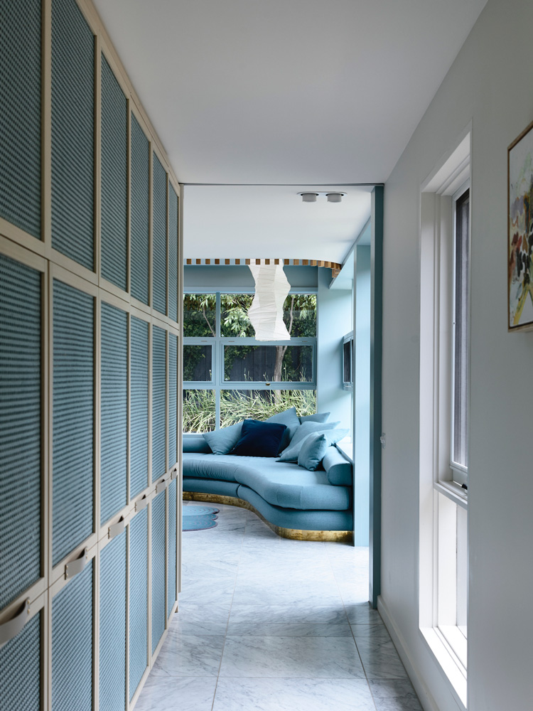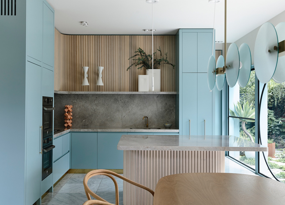 Berpadu dengan elemen bernuansa alam lainnya pada interior seperti lantai marmer dan profil kayu, warna biru muda yang cerah pada interior juga memberi suasana berbeda pada rumah (Estliving/ Yvette Caprioglio/ Kennedy Nolan)