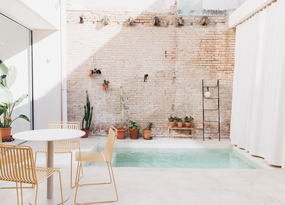 Biar memiliki luas tidak besar, rumah ini masih bisa punya private pool sendiri lho! Pilihan tanamannya pun sederhana sehingga taman tetap terasa lapang (Estliving/Alicia Macias/Jorge Soriano Lázaro)