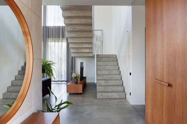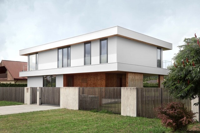 Bidang utama yang digunakan adalah plester unfinished yang dikombinasikan dengan kayu alami untuk menandai area pintu masuk. Dilansir dari archilovers, detail di fasad ini dikurangi agar rangka jendela dan aluminium terekspos dengan pagar baja di tampilannya.