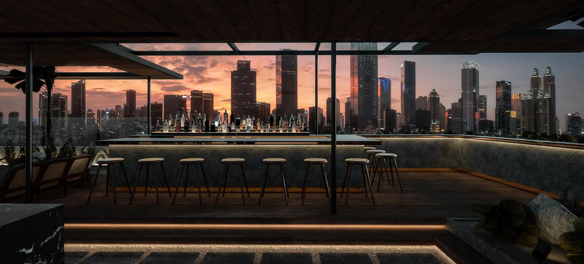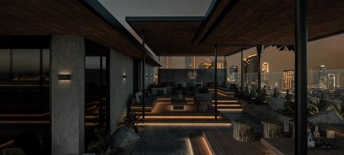 Area ini terdiri dari lounge tertutup, bar dan taman rooftop yang menggunakan pepohonan dan tanaman yang diintegrasikan ke dalam desain. Pencahayaan di dalam area sengaja dirancang redup agar pemandangan kota Jakarta di malam hari dapat terlihat dengan jelas.