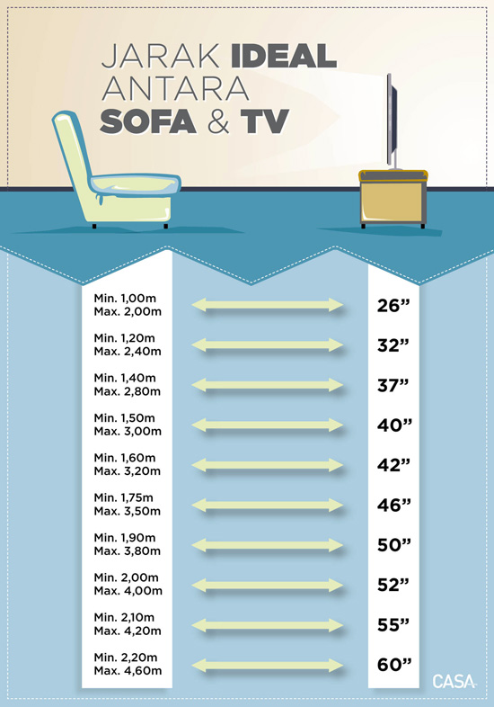 TV yang terlalu besar dapat membuat ruang keluarga Anda akan terasa sempit. Jika TV terlalu kecil dan jarak dengan sofa terlalu jauh, tentu terasa tidak nyaman saat menonton film.