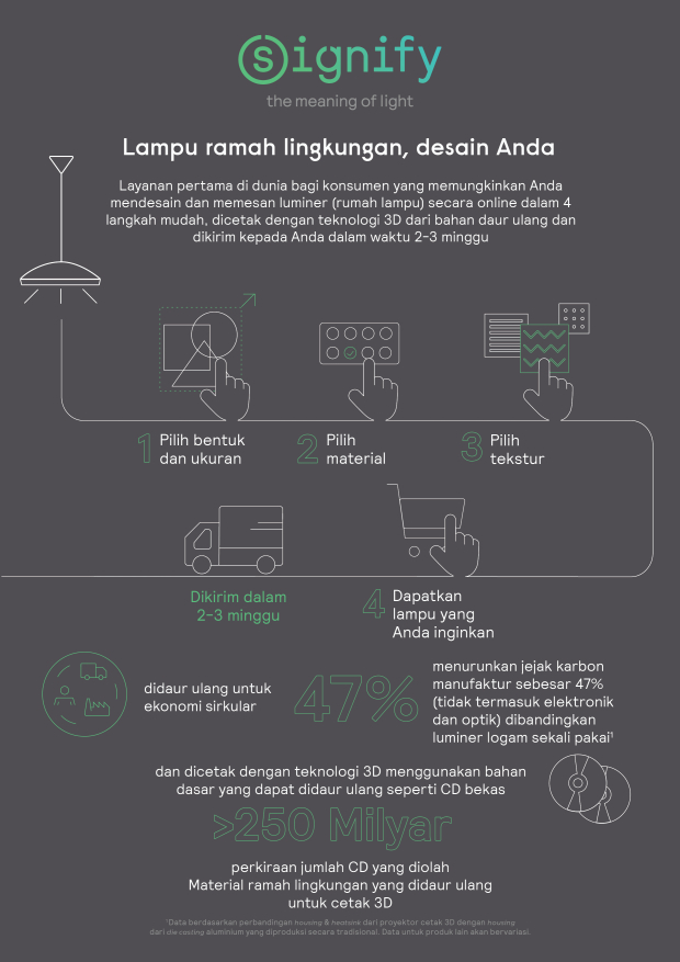 Kini, memiliki lampu yang personal sangat mungkin. tidak lagi membeli lampu yang ready stock di pasaran, tapi Anda bisa merancang sendiri lampu sesuai dengan keinginan dan kebutuhan Anda. Pada awal 2021, Signify resmi memperkenalkan sebuah layanan revolusioner pencetakan 3D Luminer di Indonesia. Layanan yang memungkinkan konsumen memesan dan mengkustomisasi lampu sesuai dengan kebutuhan dan keinginan yang dicetak secara 3D menggunakan bahan yang sepenuhnya dapat didaur ulang.